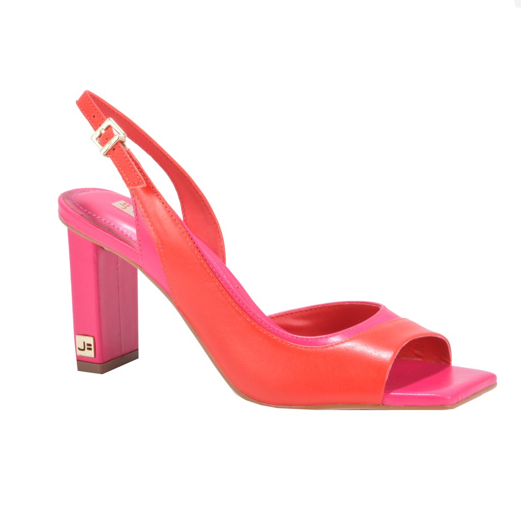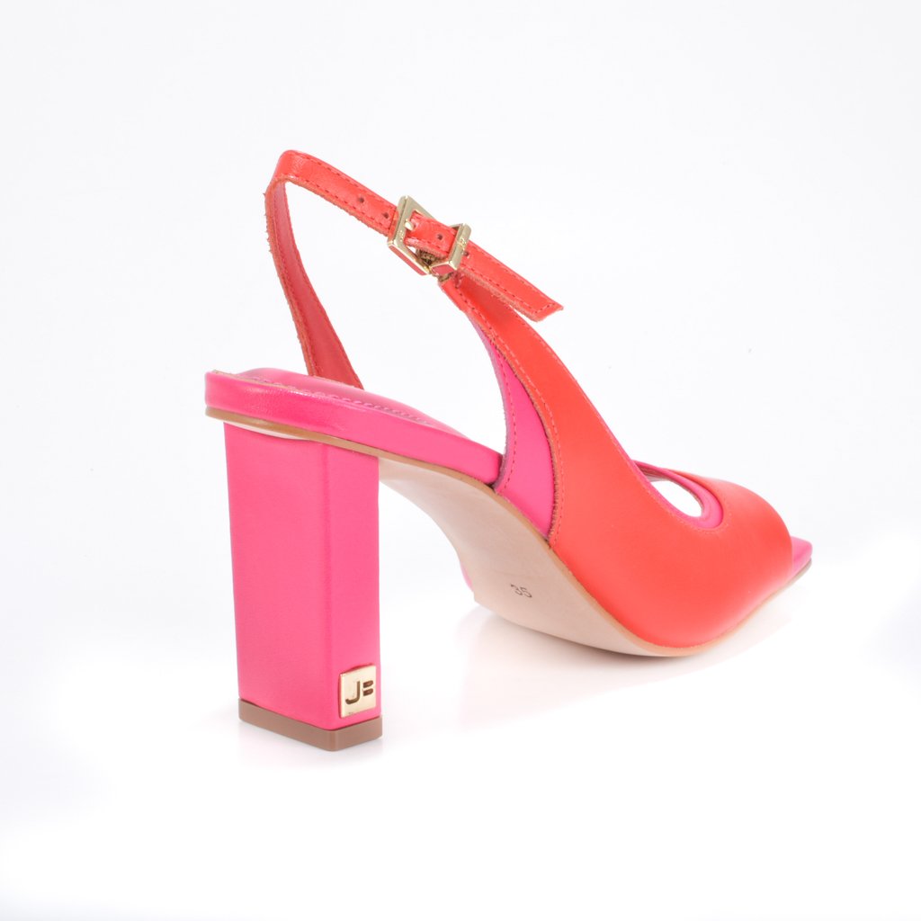 Slingback com acabamento na cor framboesa e tira no tom acerola.